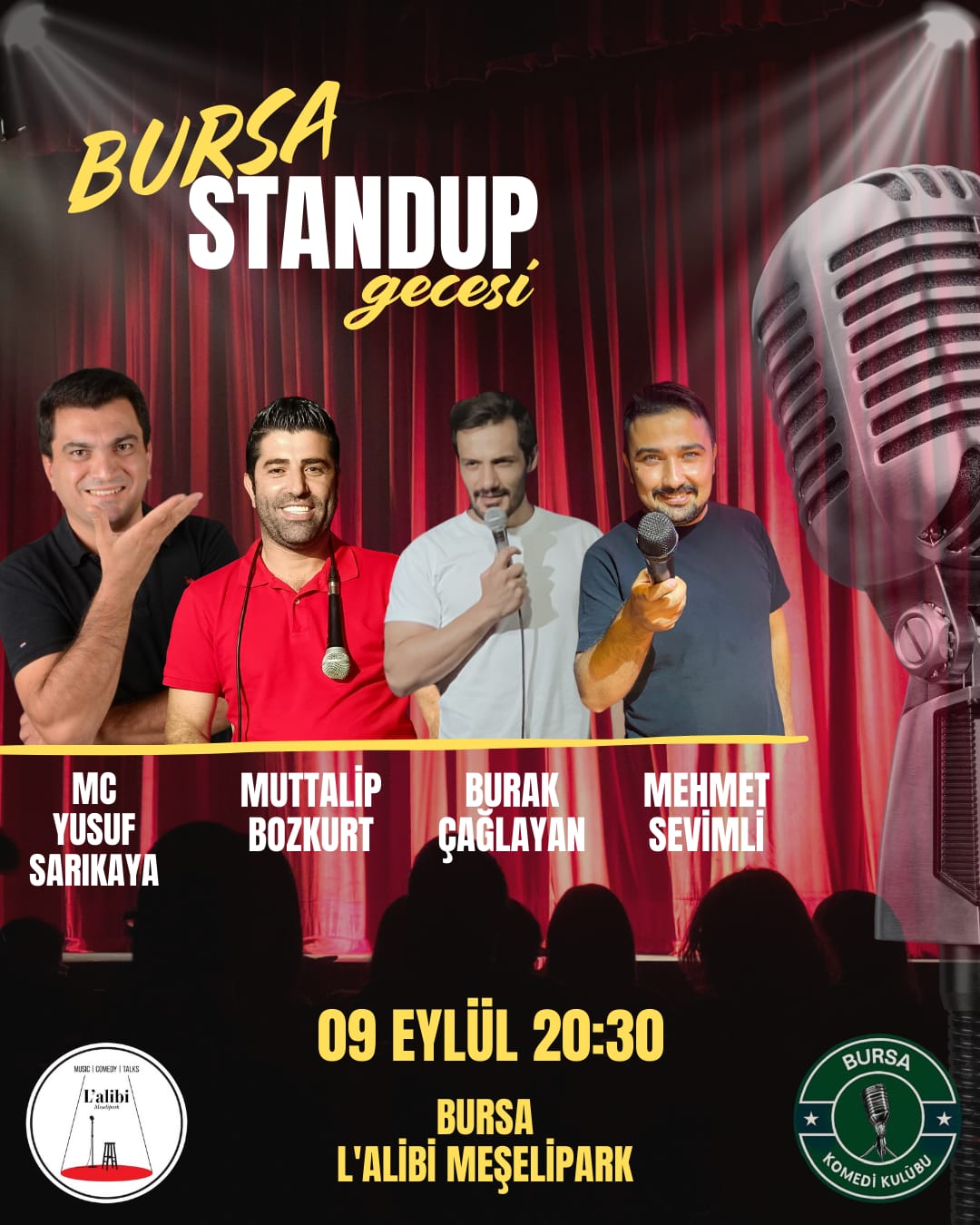 BURSALI KOMEDYENLER Bursa'da sahne alan dört komedyen en güzel hikayeleriyle ve 20 şer dakikalık performansıyla L'alibi Meşelipark'ta seyirciyle buluşuyor.Hayatın içinden gözlemler ve kesitlerden oluşan kahkaha dolu bu gösteriye sizler de davetlisiniz.