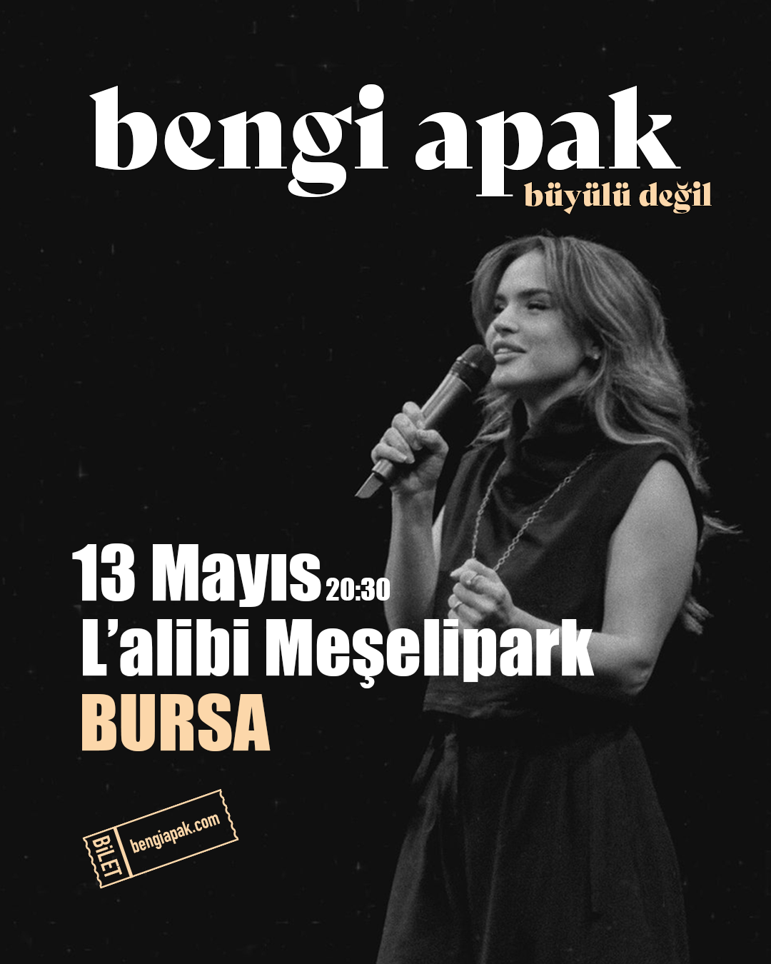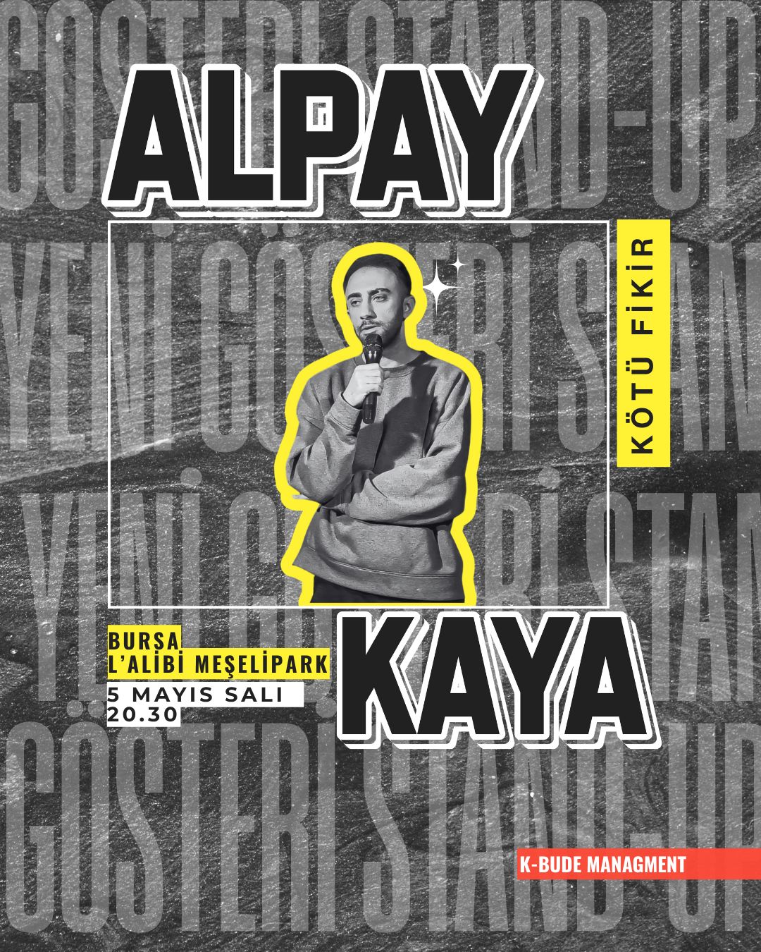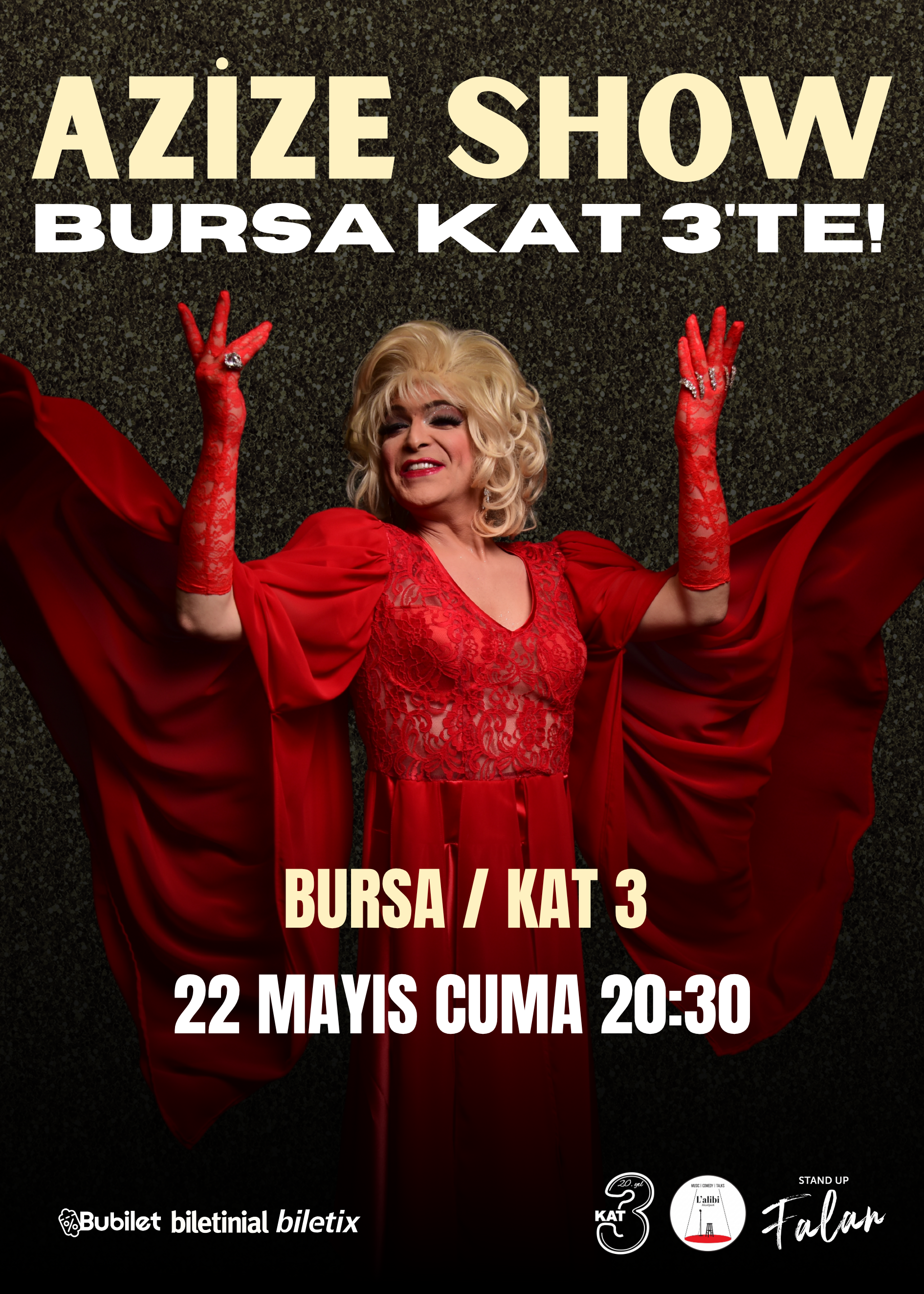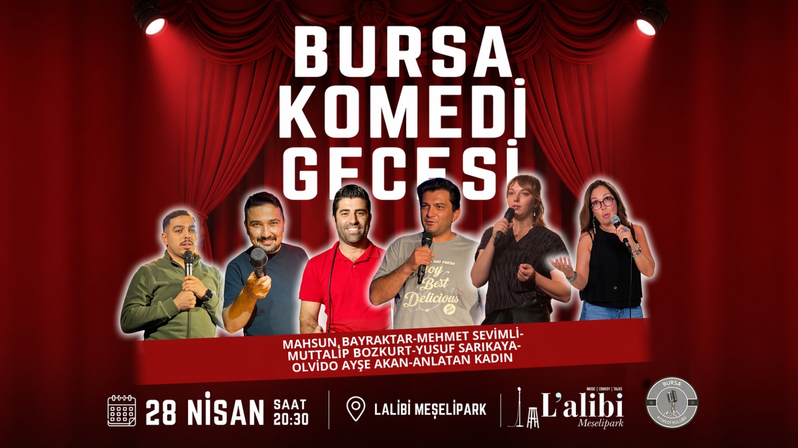 Hayatın içinden komik kesitler ve gözlemlerle altı komedyen Bursa'nın ilk ve tek komedi kulübü L'alibi Meşelipark'ta buluşuyor. İstanbul ve Bursa'da sahne alan sevilen komedyenler kahkaha dolu hikayeleriyle, eğlence dolu bir gösteri için sizlerle. Yusuf Sarıkaya, Mahsun Bayraktar, Olvido Ayşe Akan, Muttalip Bozkurt, Mehmet Sevimli ve Anlatan Kadın'in sahne alacağı bu eğlence dolu gösteriye sizler de davetlisiniz.